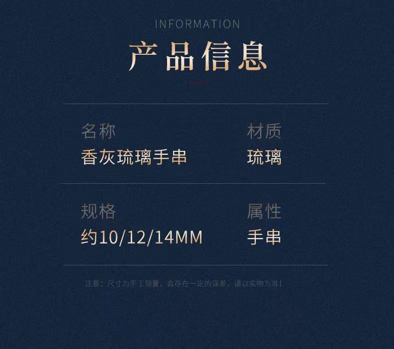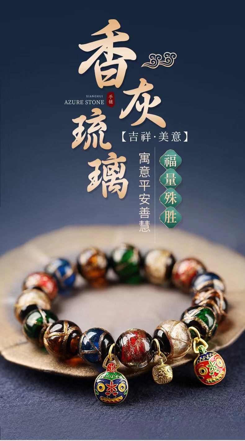 :本品為手工香灰琉璃與景泰藍工藝,每串手串色澤、紋理略有差異,屬正常現象。
