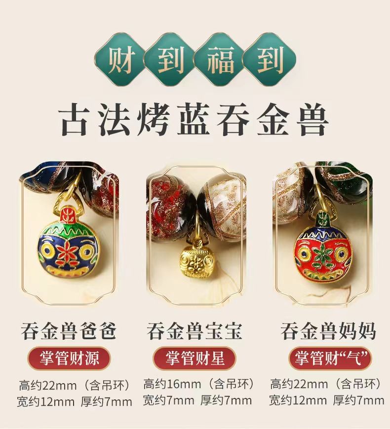 材質工藝:青城道場香灰琉璃珠(五行對應色)、非物質文化遺產景泰藍吞金獸吊墜,古法金飾點綴